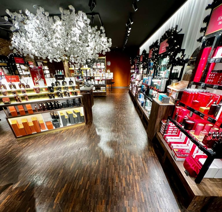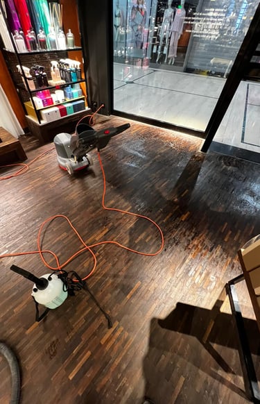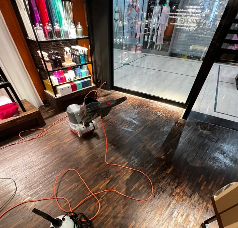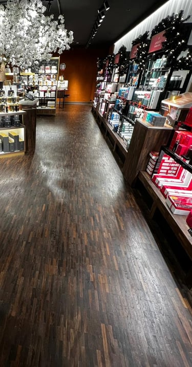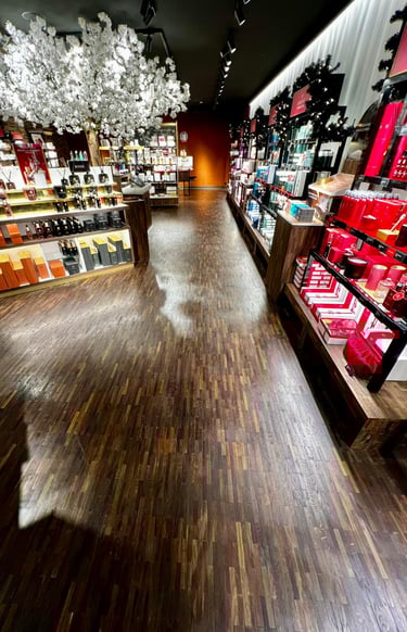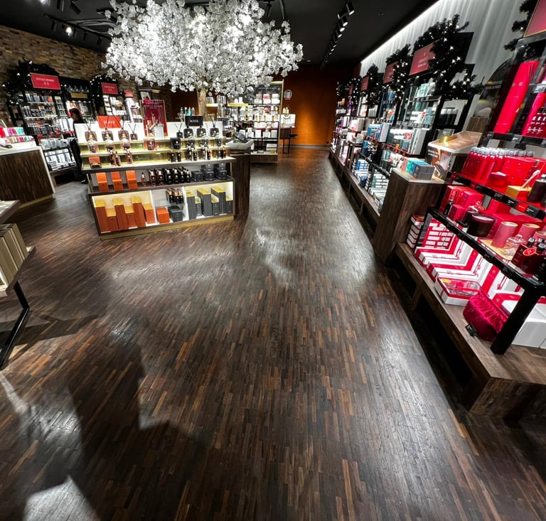 Intervention de rénovation de sol parquet en boutique à Amiens (80000) comprenant le décapage complet de l’ancienne cire, le nettoyage en profondeur, puis l’application d’une nouvelle cire de protection avec lustrage à la monobrosse.